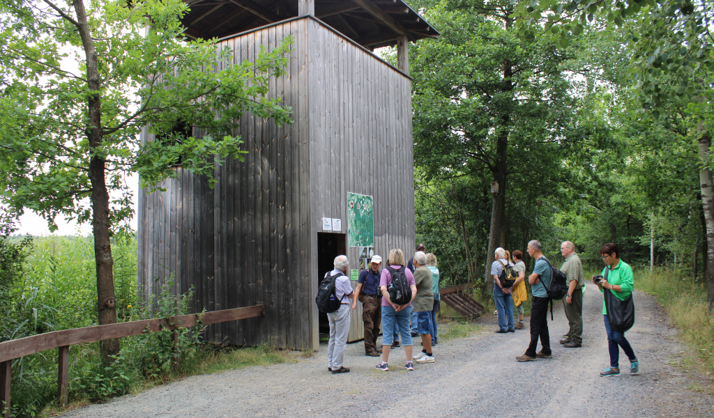 Auf jede der zahlreichen Fragen konnte Herbert Schnabel Antwort geben. Ausführliche und detailgenaue Erläuterungen gab es auch bei einem Zwischenstopp am NABU-Aussichtsturm. Seit Juli 2009 können Besucher des Wanderweges hier aus der Höhe die herrliche Aussicht auf die Landschaft genießen.
