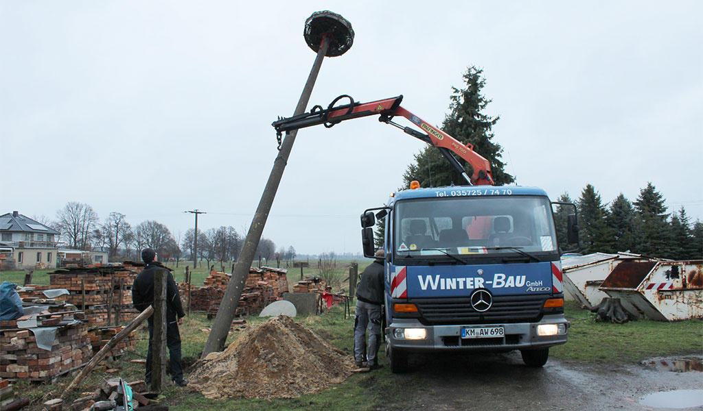 Als Nistunterlage wurde ein altes Metallrad einer Beregnungsanlage aus LPG-Zeiten mit Weidenruten ausgeflochten und Heu in die Nistmulde eingelegt. Einen zwölf Meter langen Betonmast spendete die Firma Elektroanlagen Nowack aus Schwarzkollm vom Abriss der 20 KV-Leitung von Wittichenau nach Hoske im September 2019 und transportierte den Mast zum vorgesehen Standort nach Keula. Auf dem Grundstück von Peter Schierack nahe an der Bebauung und am Rande einer Pferdekoppel wurde nun am 7. März 2020 mit großer Unterstützung der Firma Winter-Bau GmbH ein zwei Meter tiefes Erdloch ausgebaggert und der Mast mit montierter Nisthilfe mittels Ladekran aufgestellt. Nun hoffen wir, dass die Störche das neue Nest annehmen und die Dorfbewohner und Gäste wieder mit ihrem Klappern erfreuen.